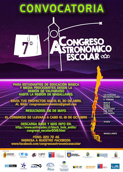 La convocatoria para postular proyectos astronómicos se extenderá desde el 5 hasta el 7 de mayo de 2019 y está dirigida a parejas de estudiantes de 6to a 8vo de Educación Básica y de 1ro a 3ro de Educación Media. Quienes quieran postular deben enviar sus consultas y proyectos al mail congresoastronomico@gmail.com. Las bases y formulario de postulación se encuentran disponibles aquí: